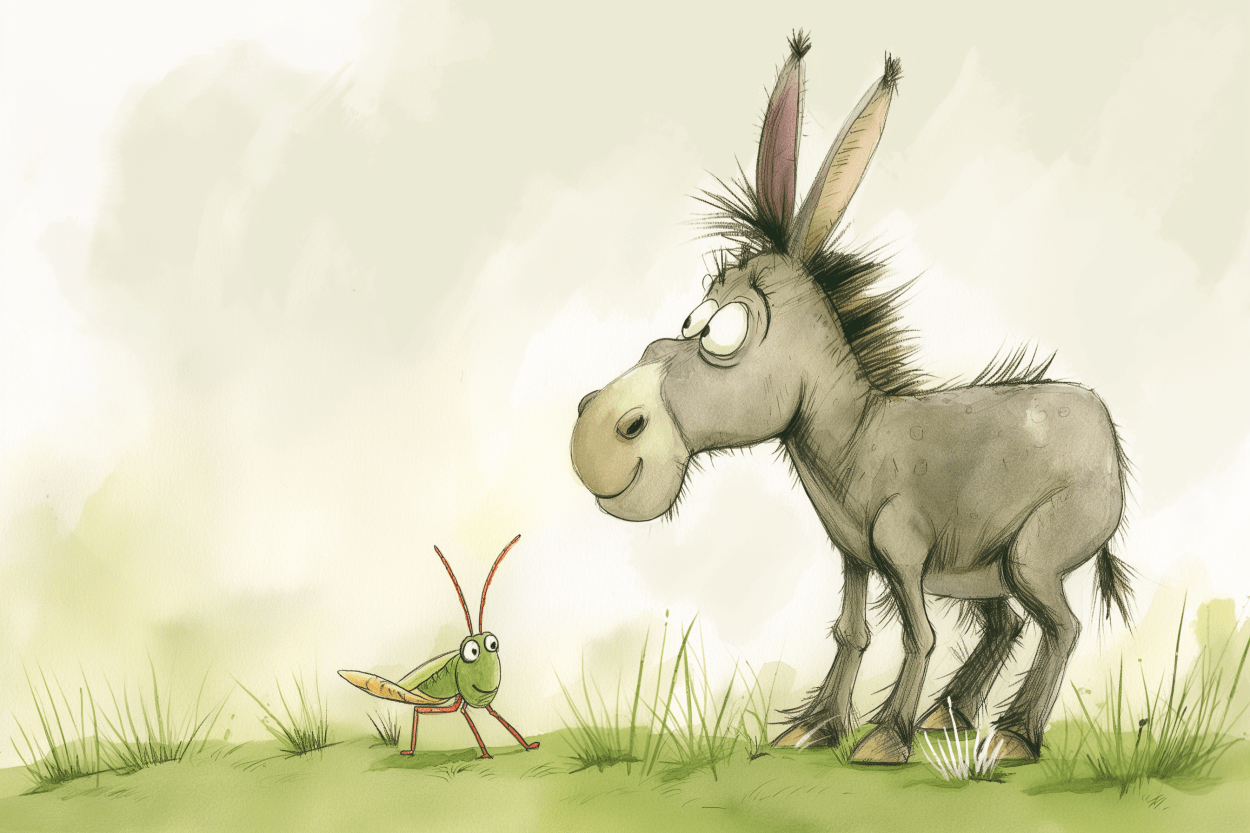 Once upon a time, in a sunny meadow filled with colorful flowers, there lived a curious donkey named Gailen. Gailen loved to explore and discover new things. One warm afternoon, while he was grazing on some delicious grass, he heard the most enchanting music. He followed the sound until he found a group of tiny grasshoppers happily chirping away.